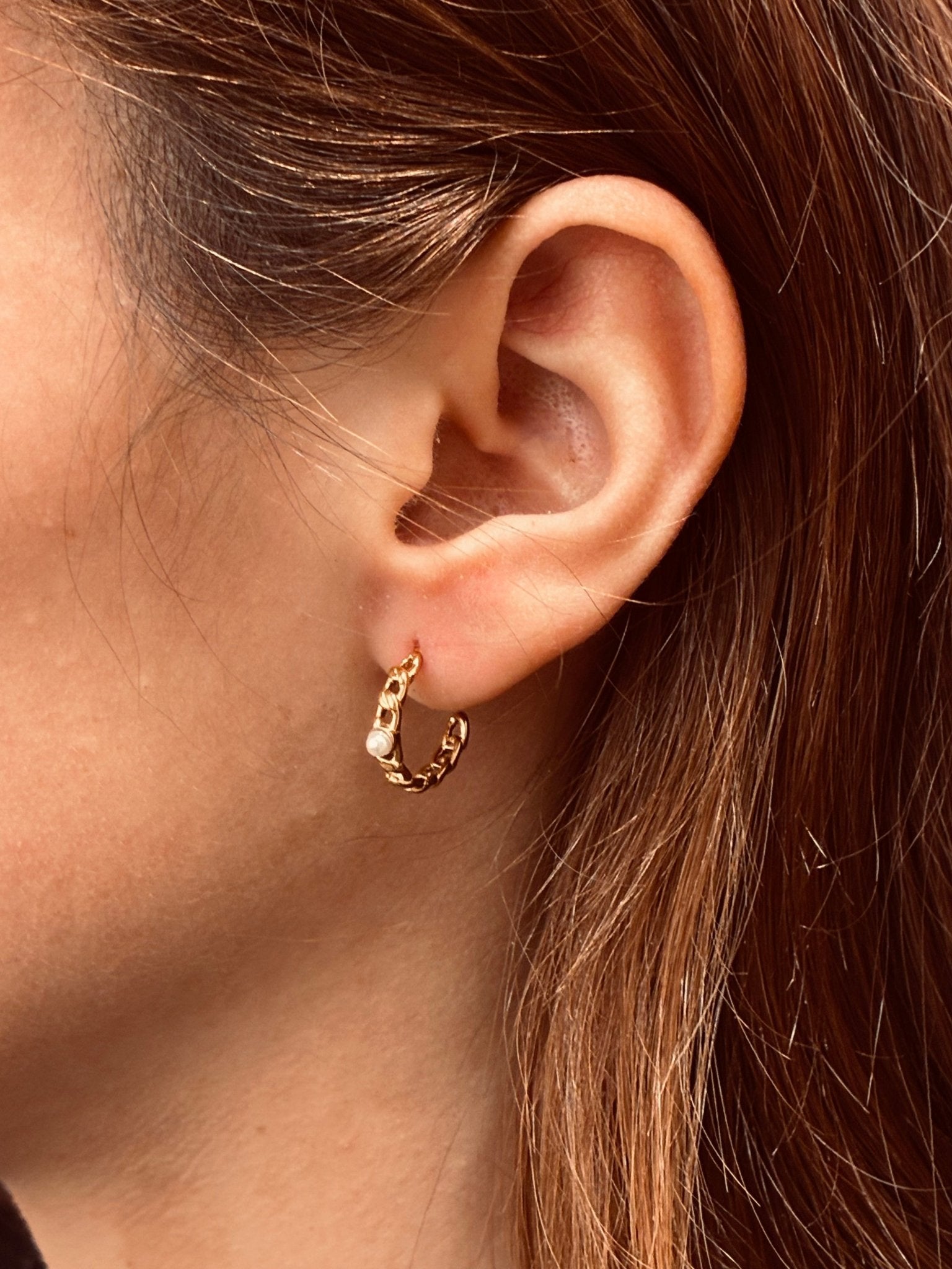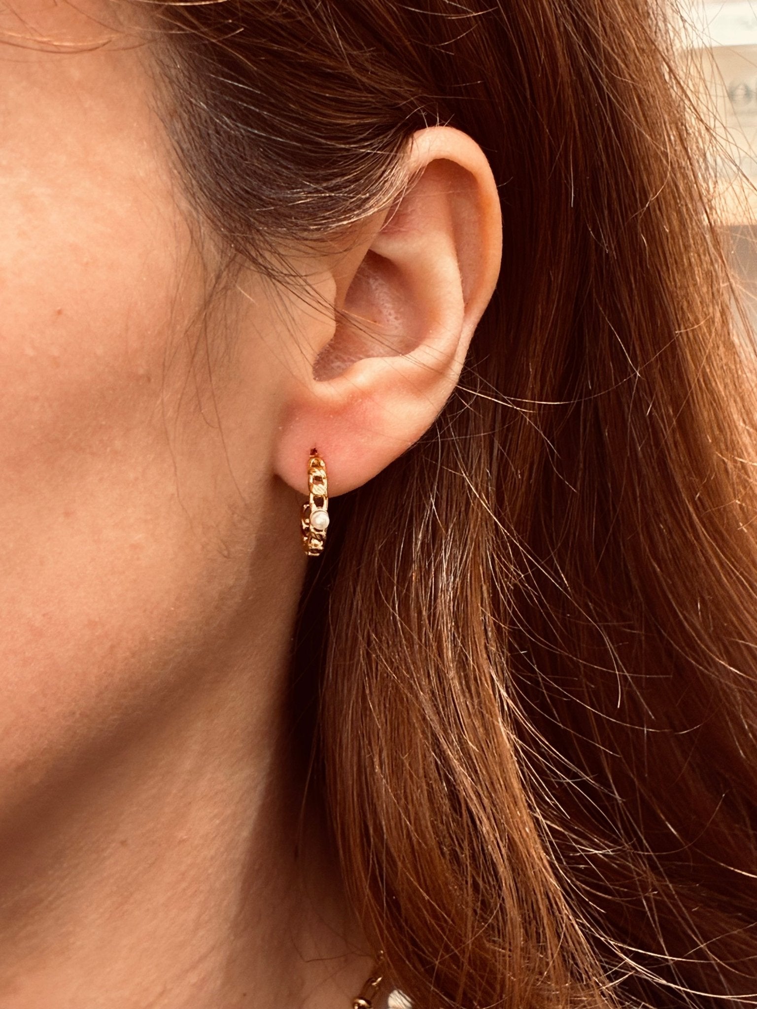 Les boucles d’oreilles Noélie revisitent la créole avec un twist : une demi-boucle torsadée façon maille, rehaussée d’une perle d’eau douce naturelle. Un bijou discret mais raffiné, à la fois moderne et intemporel.
