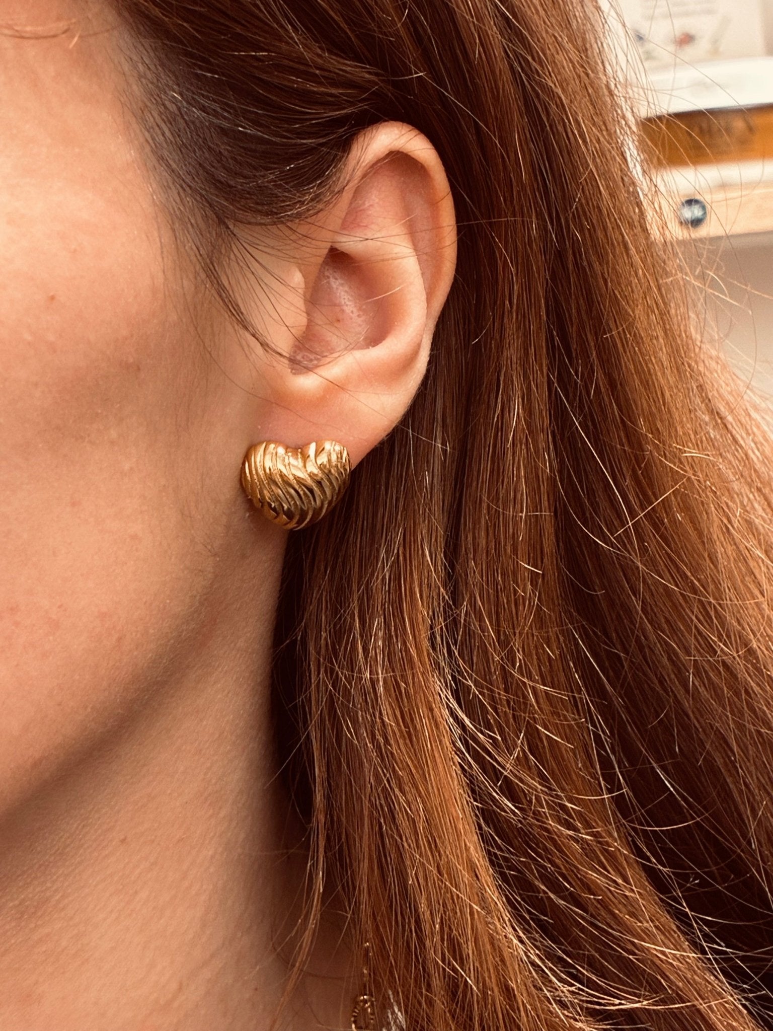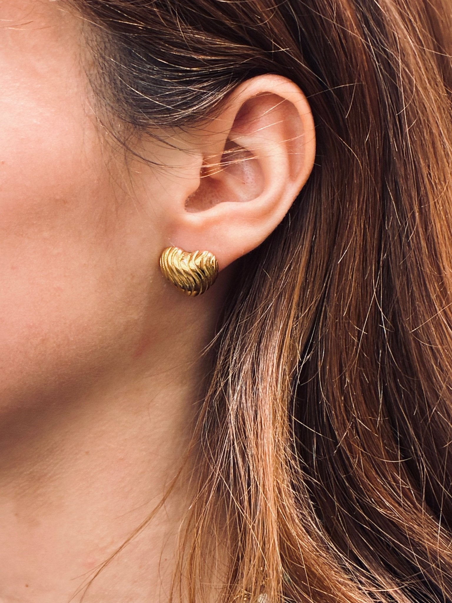Les boucles d’oreilles Cœur II revisitent le symbole amoureux avec une forme généreuse et un travail de matière texturé. Leur surface striée capte la lumière à chaque mouvement, pour une allure à la fois douce et affirmée.
