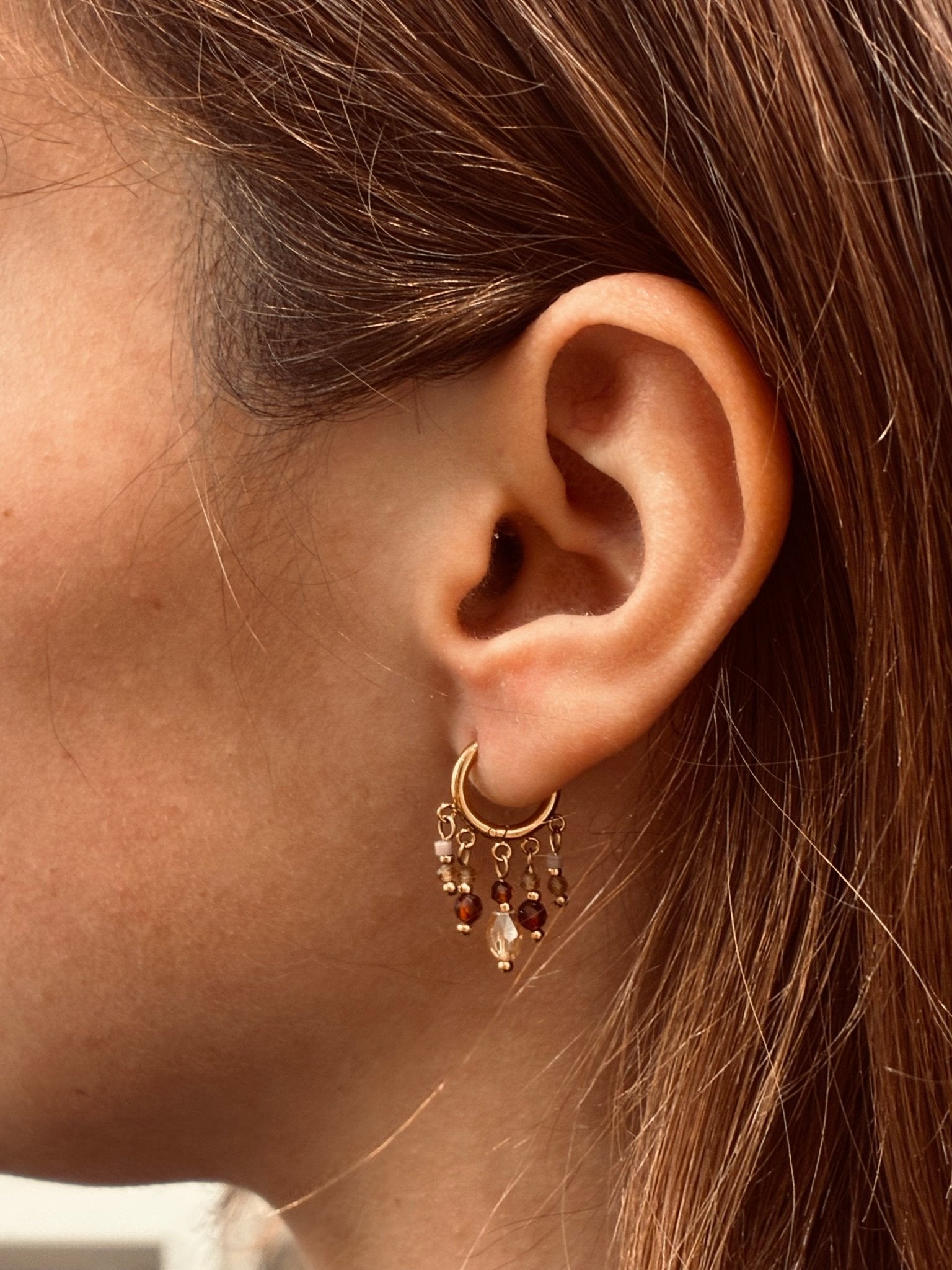 Les boucles d’oreilles Emilia se distinguent par leur design dansant et lumineux. Chaque mini créole dorée est ornée de cinq breloques composées de perles en cristal et pierres fines dans des tons orangés et dorés. Un modèle à la fois léger et vibrant, parfait pour illuminer vos looks d’un éclat chaleureux.