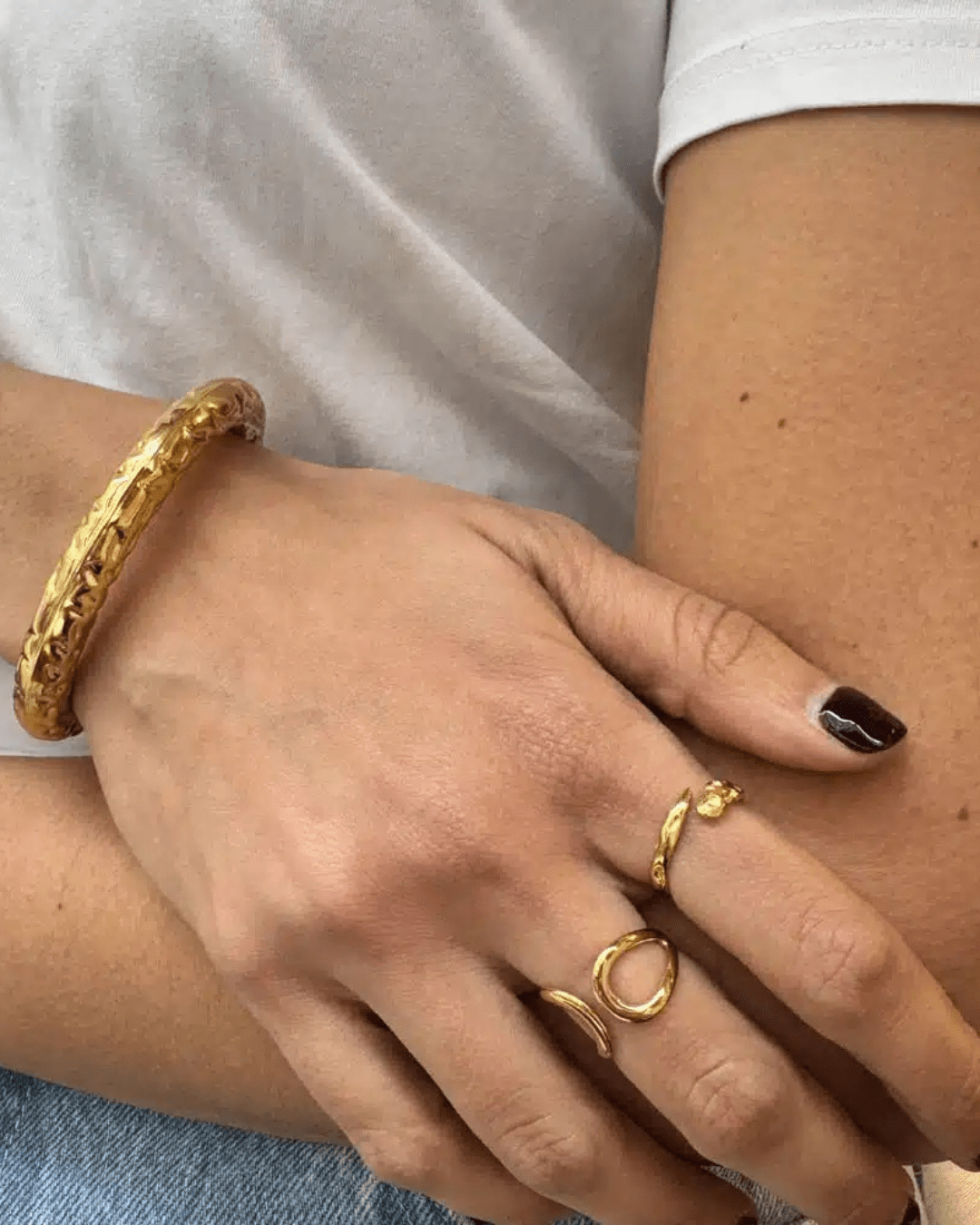 Son jeu de lignes rondes crée une silhouette graphique et moderne qui structure élégamment la main. Épurée mais affirmée, elle apporte une touche contemporaine à toutes vos tenues.