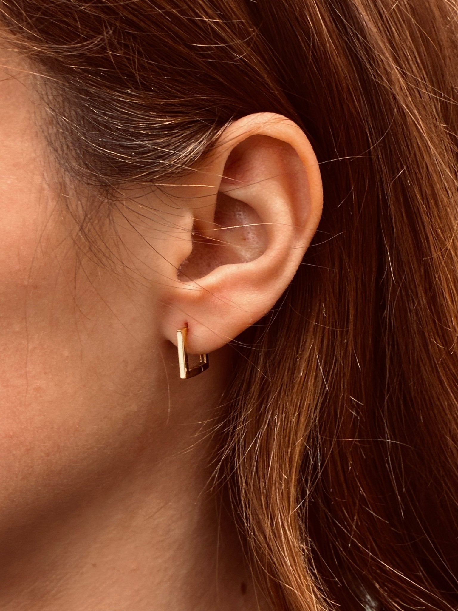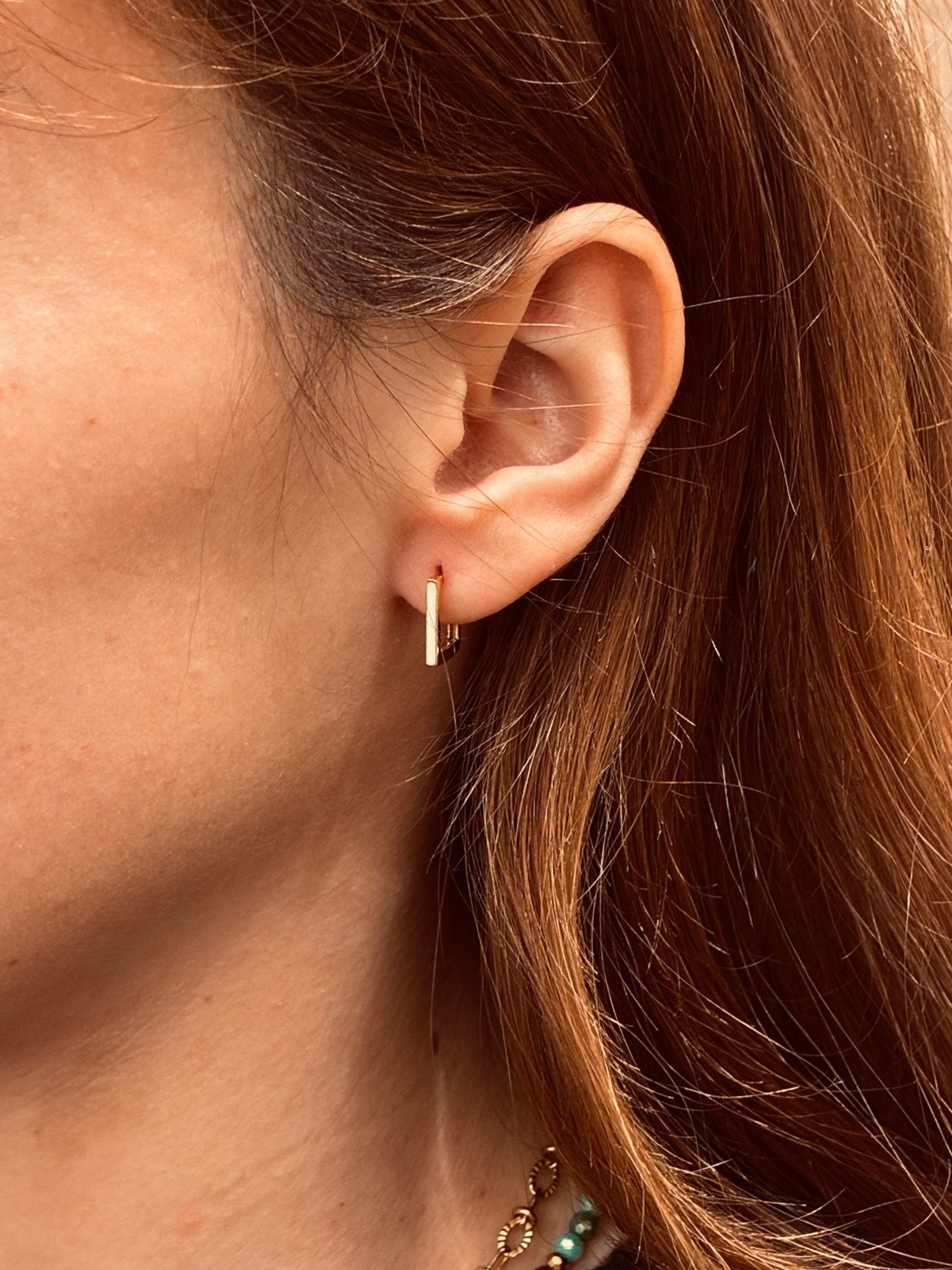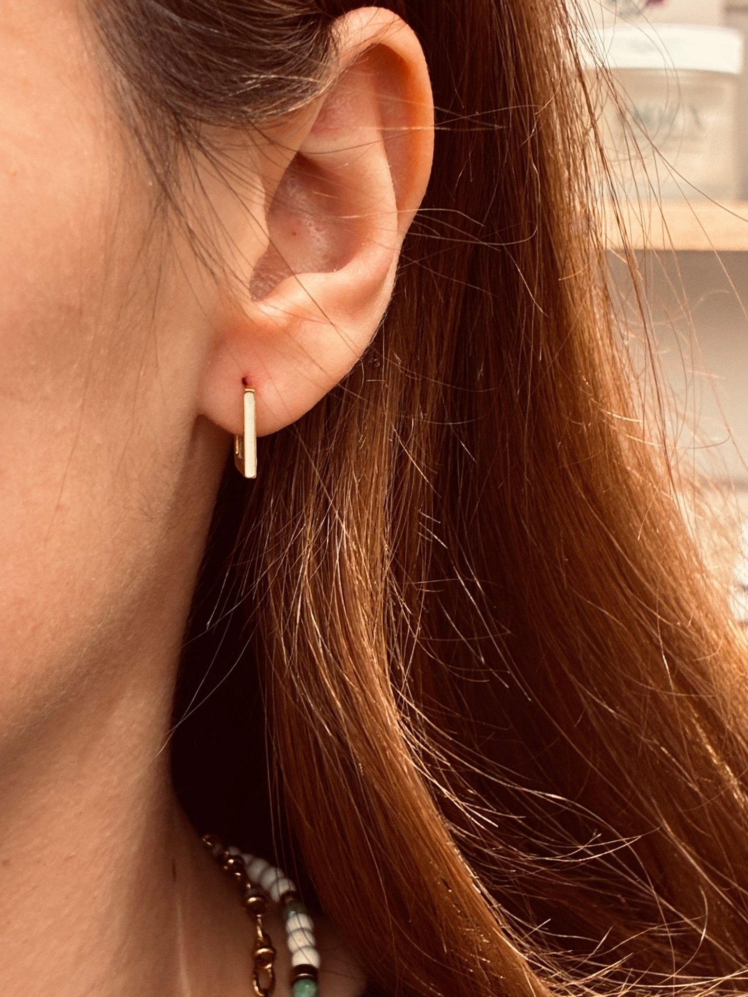 Les boucles Nari adoptent une silhouette fine et contemporaine avec leur forme carrée minimaliste et leur détail en émail blanc. Lignes nettes, éclat doré et design épuré en font un bijou chic et facile à porter, qui sublime le port de tête tout en douceur.