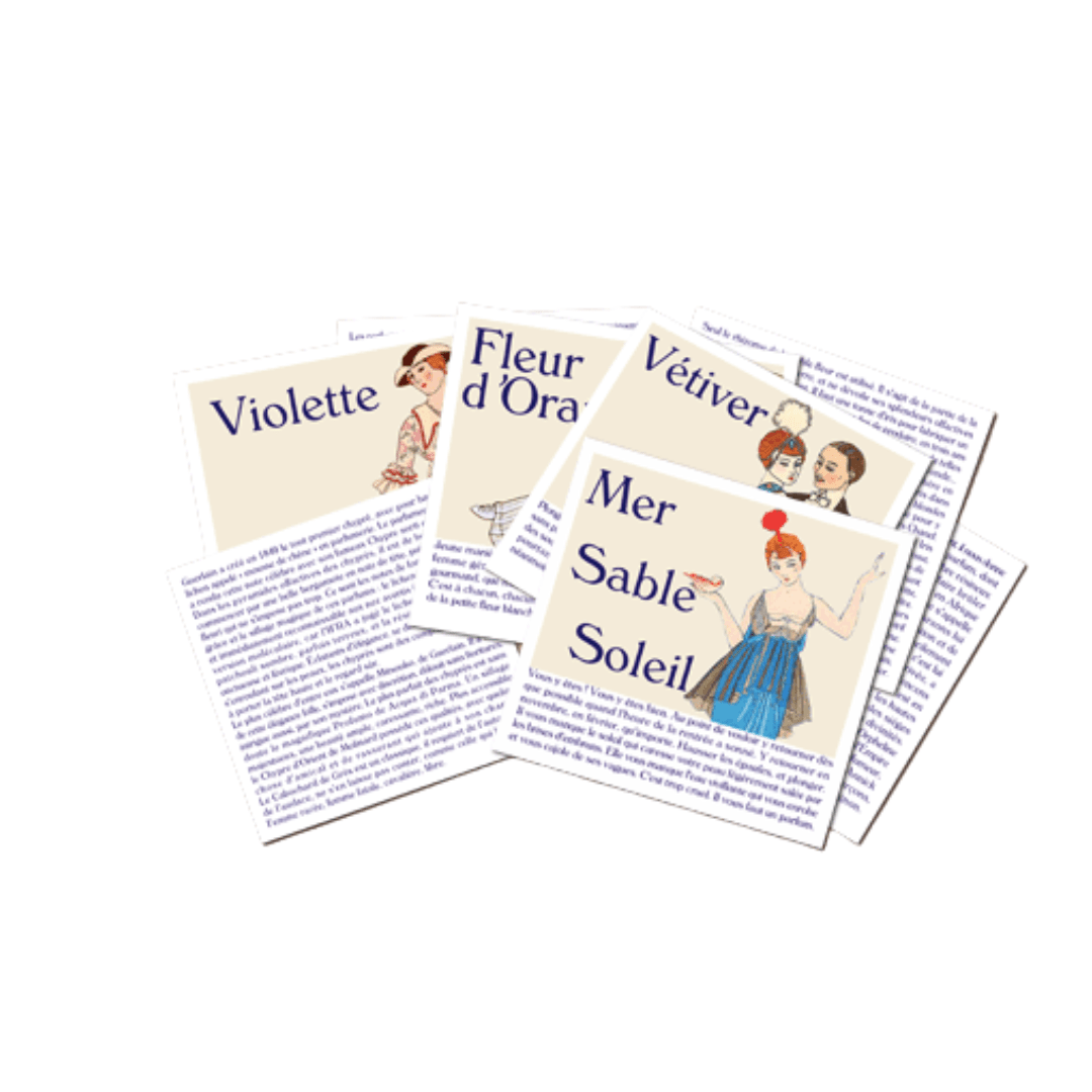 Chaque carte dévoile un parfum culte, ses accords, son caractère et ses inspirations. Une manière ludique, poétique et sensorielle de découvrir l’univers de la parfumerie — entre fleurs, bois, soleil, mer et essences envoûtantes.