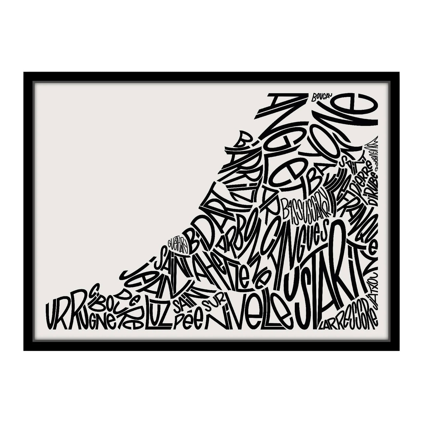 • Affiche sur la laquelle chaque nom de ville est écrit selon la place que celui-ci prend sur le plan. Ensemble, mis côte-à-côte, les noms forment la Côte Basque. Les villes représentées sont Biarritz, Guéthary, Saint Jean de Luz, Ciboure, Bidart, Bayonne, Anglet, Arcangues, Urrugne, Arbonne, Bassussarry, Saint Pée sur Nivelle, Ahetze, Ustaritz, Villefranque, Mouguerre, Saint Pierre d'Irube, Larressore et Jatxou.