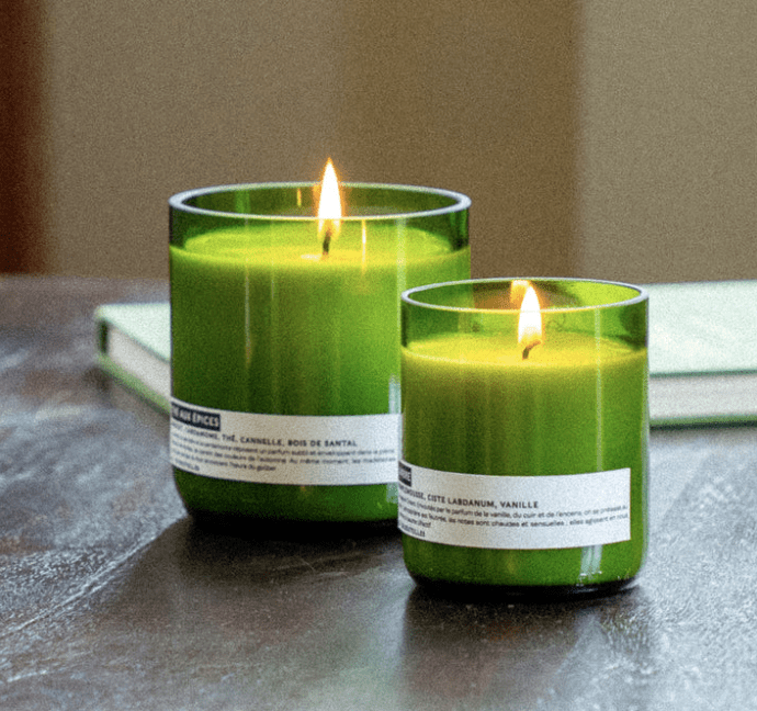 • Le contenant en verre recyclé, réutilisable comme verre une fois la bougie terminée.