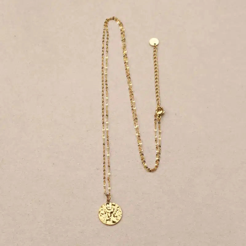 Son pendentif circulaire à la texture martelée évoque une médaille solaire aux reliefs organiques. Une pièce lumineuse qui attire le regard tout en conservant une grande finesse.
