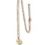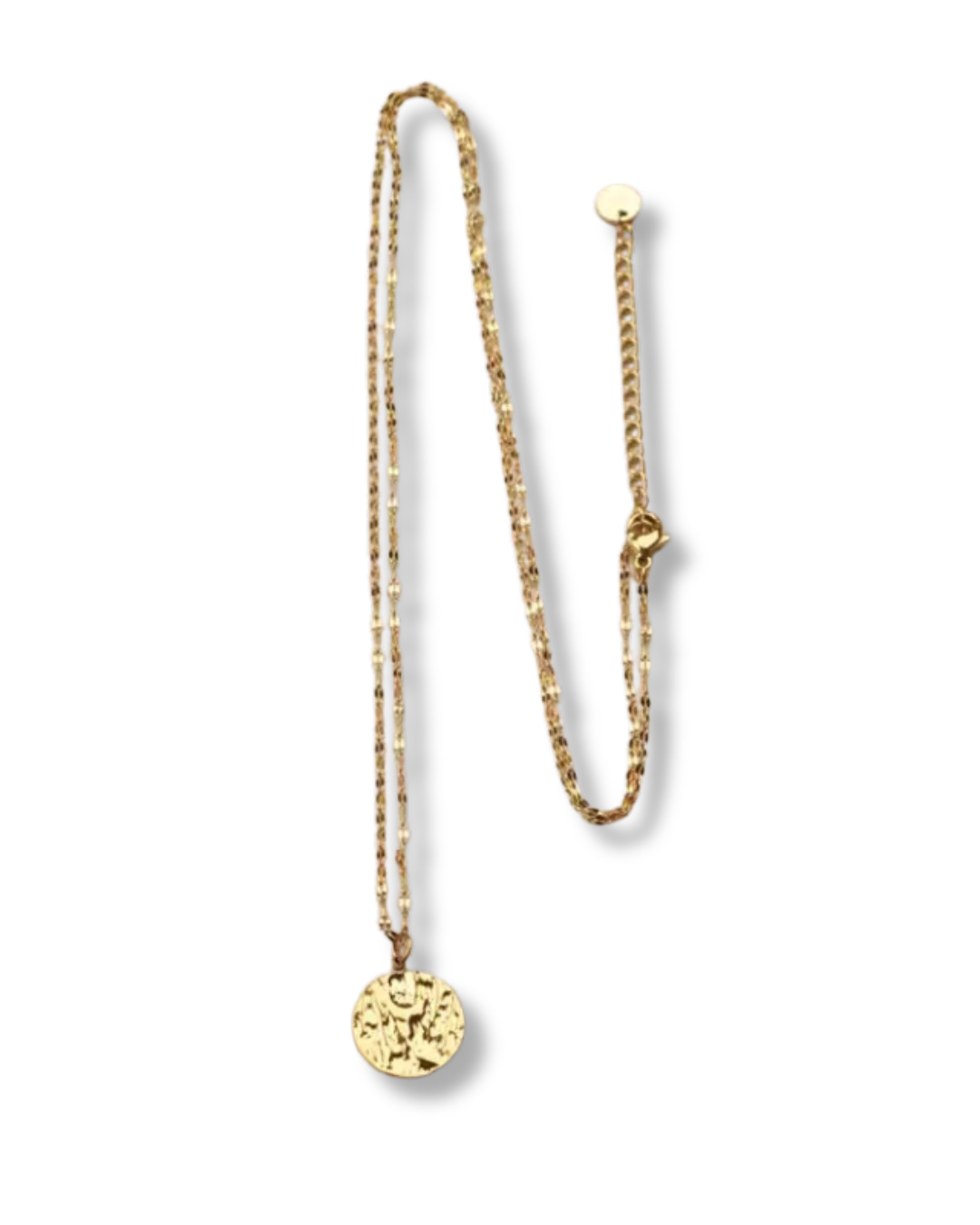 Le sautoir Onda nous a séduites par sa médaille martelée à l’esprit solaire et sa chaîne lumineuse qui habille le cou avec élégance..